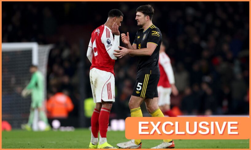 Gabriel of Arsenal and Harry Maguire of Manchester United interact at full-time following the Premier League match between Arsenal and Manchester United at Emirates Stadium on January 25, 2026 in London, England. (Photo by Alex Pantling/Getty Images)