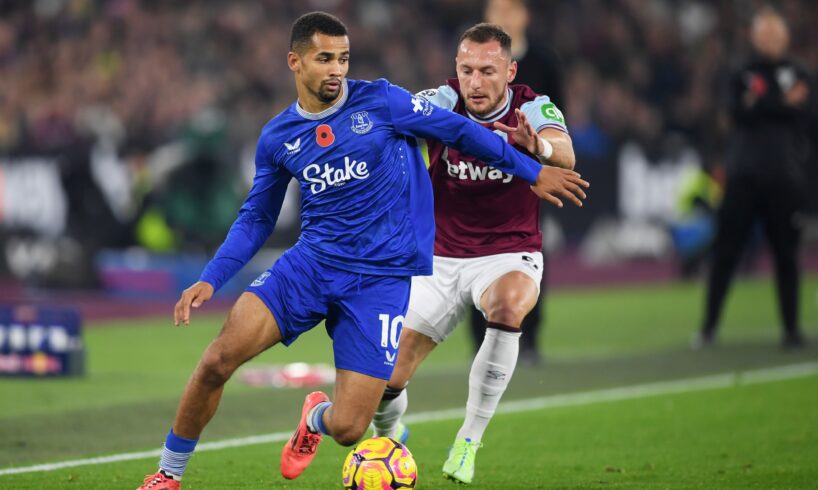 Iliman Ndiaye of Everton is challenged by Vladimir Coufal of West Ham United. (Photo by Harriet Lander/Getty Images)