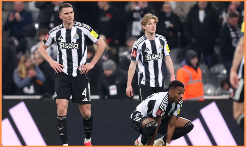 Anthony Gordon and his Newcastle teammates look on (Photo by George Wood/Getty Images)